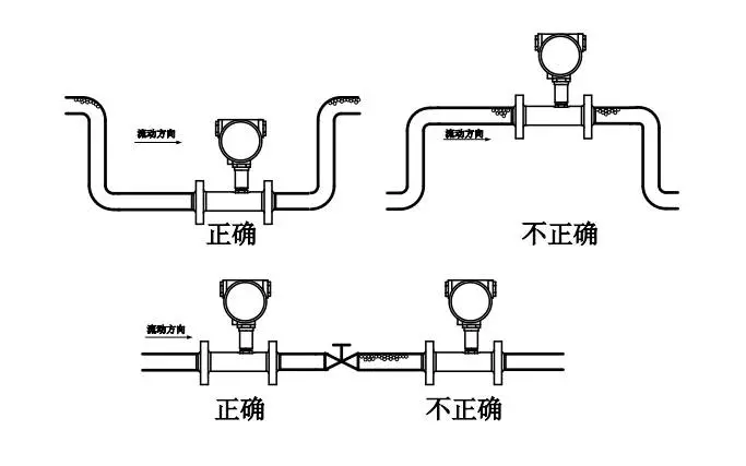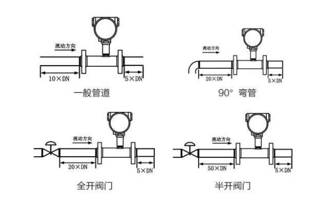 2、 安裝時液體流動方向應與傳感器外殼上指示流向的箭頭方向一致,且上游直管段應≥20dn,下游直管段應≥5dn(dn為管道內徑)。